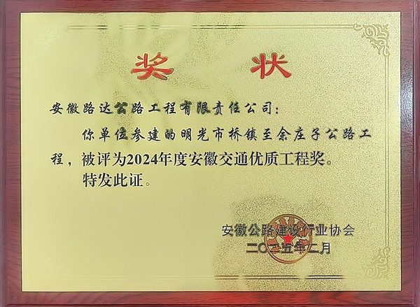 近日,安徽省交通運(yùn)輸廳公布了2024年度安徽交通優(yōu)質(zhì)工程獎(jiǎng)評(píng)選結(jié)果,路達(dá)公司承建的明光市橋鎮(zhèn)至余莊子公路工程榮獲2024年度安徽交通優(yōu)質(zhì)工程獎(jiǎng)。