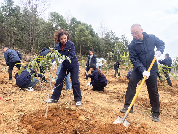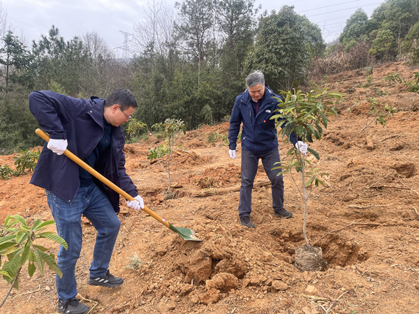 活動現(xiàn)場,各部室干部職工熱情高漲,干勁十足,大家三兩搭配,配合默契,熟練地揮鍬鏟土、扶苗填坑、培土澆水,各個環(huán)節(jié)銜接有序,一派熱火朝天的植樹場景。經(jīng)過近兩個小時的辛勤勞作,近百棵白玉枇杷樹樹苗全部栽種完畢,初春的土地呈現(xiàn)出一片勃勃生機。
